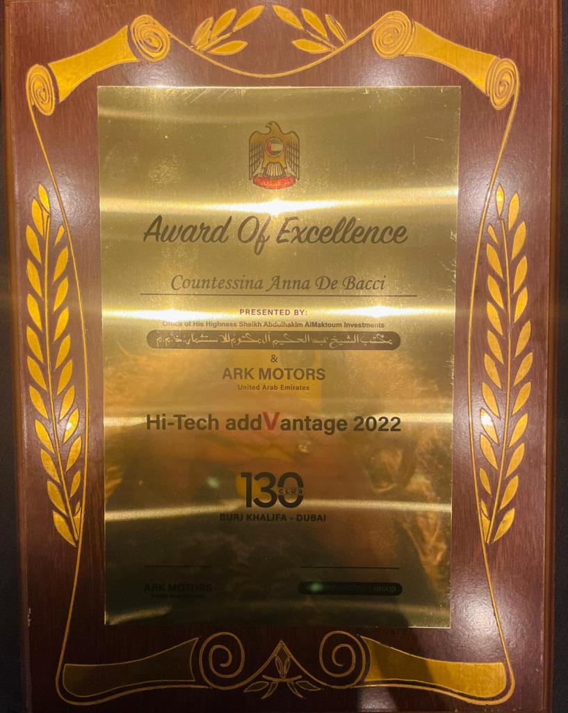 Countessina Anna received an Award of Excellence from the Office of His Highness Sheikh Abdulhakim Almaktoum Investments and ARK Motors.